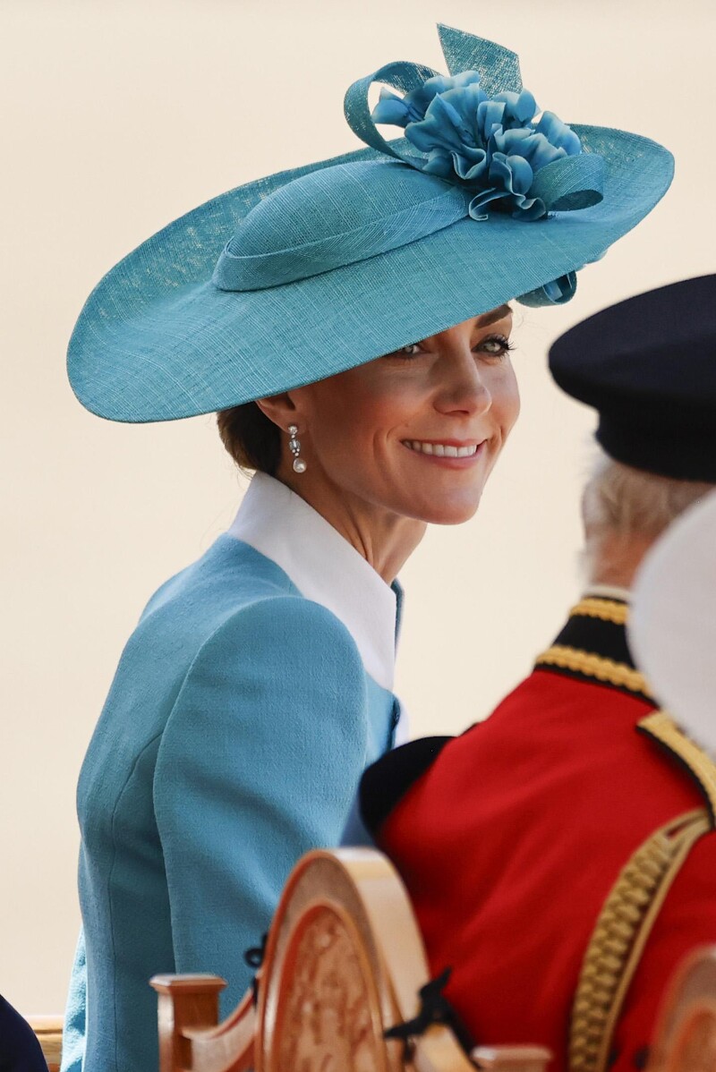 另外,一项备受瞩目的当然还有皇室造型,今日的庆典,凯特王妃选择了挚爱的设计师Catherine Walker的订製礼服,搭配Juliette Botterill设计的斜戴帽饰,并佩戴伊莉莎白二世女王的爱尔兰卫队胸针与珍珠耳环。细节间尽是温婉、坚毅与对传承的温柔致敬。