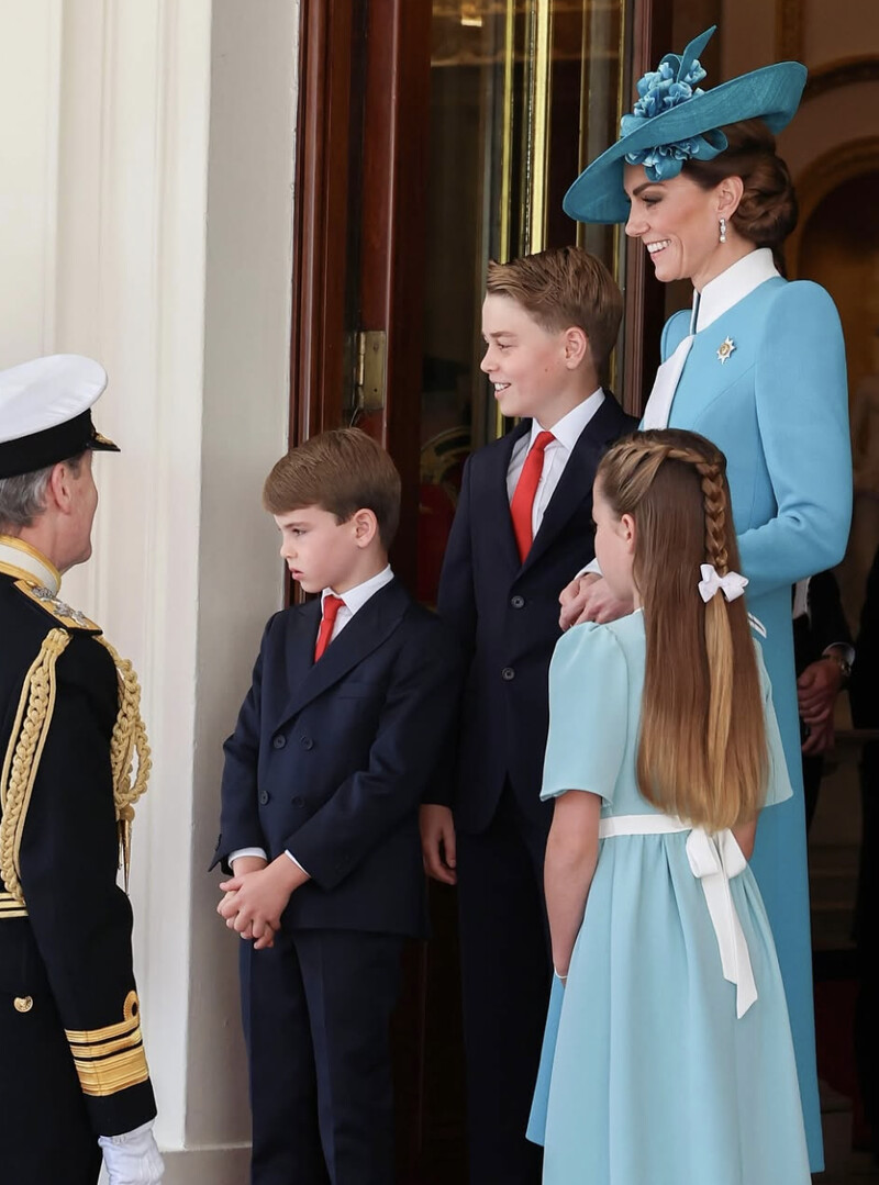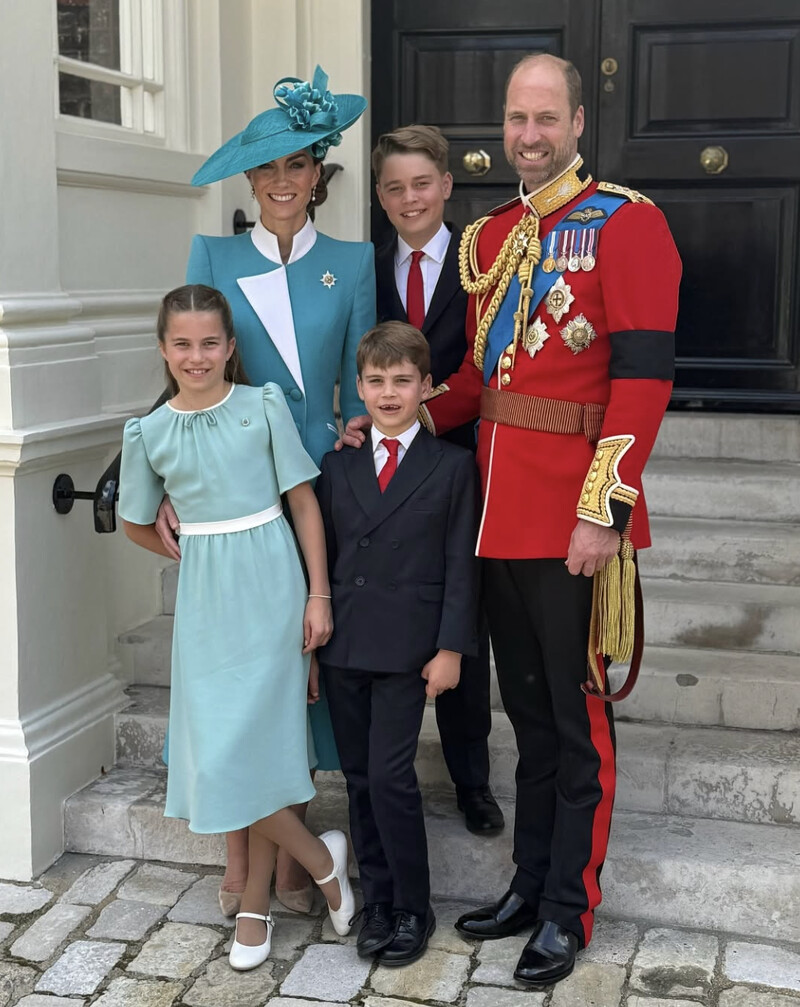 凯特王妃今天佩戴了伊莉莎白女王的珍珠耳环,洋装上还别着一枚爱尔兰卫队军团胸针,极具巧思。 一家五口的合影登上白金汉宫前阶梯,从服装色调到合照都呈现完美的搭配细节,可以看见11岁的乔治王子与7岁的路易王子都以西装搭配红色领带呼应父亲威廉王子军装上的红色细节,处处可见王室在仪式与风格之间的完美平衡。