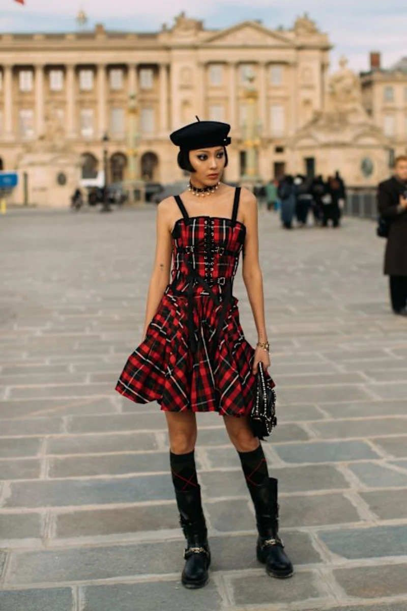 庞克风穿搭常让人难以联想到该配什么帽子,多数人会直觉选择皮革帽款、毛帽等风格相近的单品,但千万别被这种框架限制!不妨搭配一顶素色贝雷帽,为造型增添反差感,建议选择皮革材质或版型硬挺的款式,进一步强化摇滚风刚硬与强烈的视觉效果。
