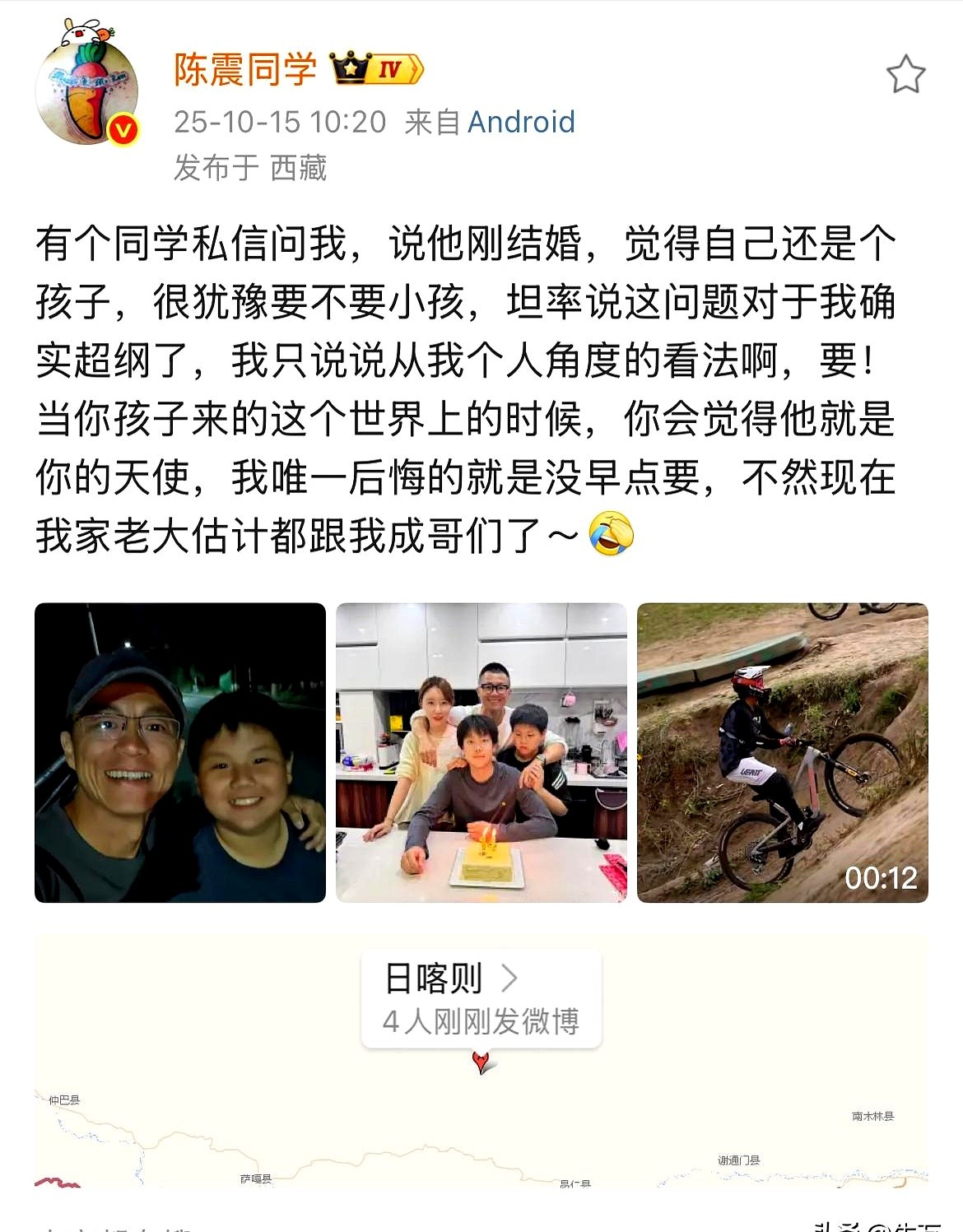 在海拔三千八的日喀则,汽车圈老熟人陈震晒出四口之家合照并配字“要孩子,因为你是他的天使”,画面暖得像开高饱和度滤镜,可弹幕区瞬间分裂——有人给他点赞说“有娃才完整”,也有人回怼“月嫂费一晚顶我半个月房租”。
